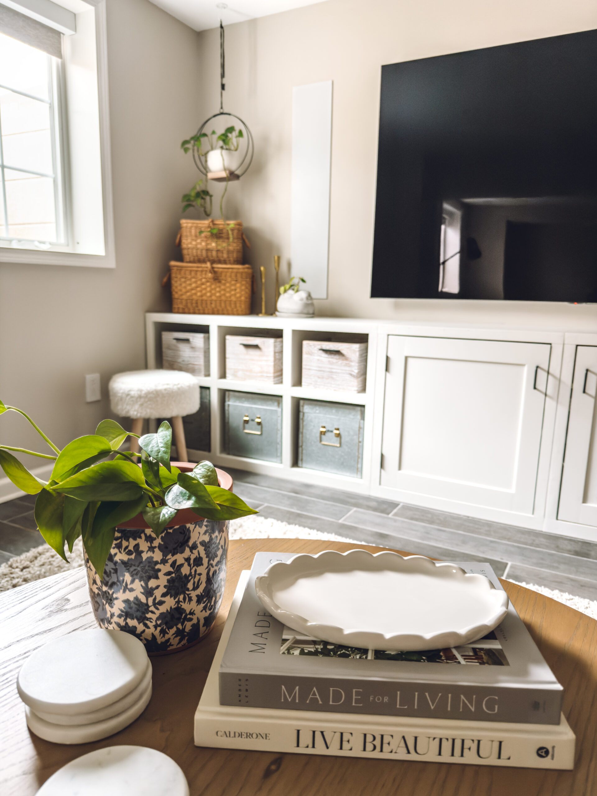 This little scalloped tray can be used in lots of different ways. Simply placed on a stack of books along with a floral planter is an easy way to add spring decor to the home.