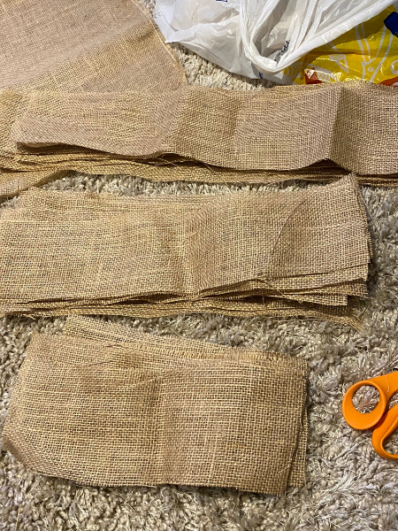 1. Cut the burlap into different sized strips (for different sized roses), approximately 4 inches wide.