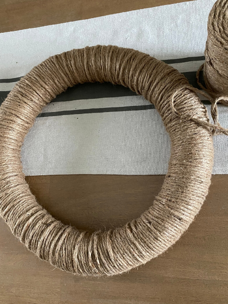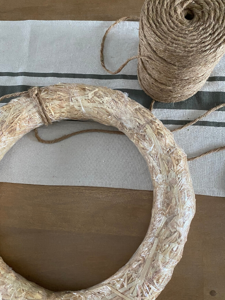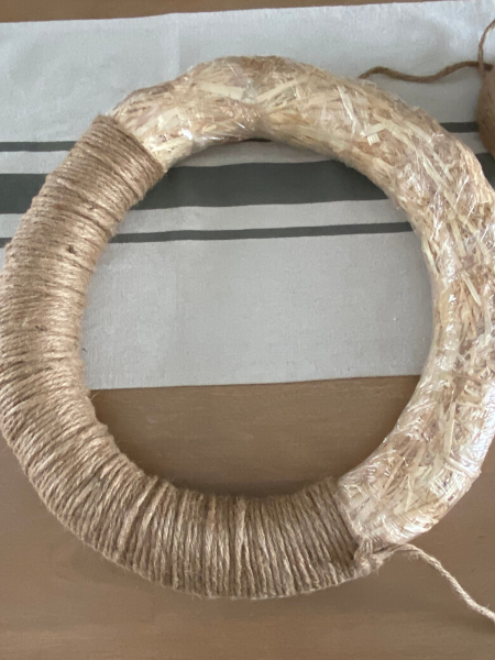 1. Tie the jute yarn in a knot around the wreath. You may want to ball up the yarn first if it is to big to work with as is.