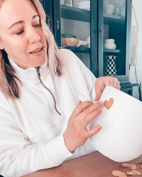 2. Once your hearts are ready, take your foam brush and paint on the Mod Podge onto a small section of the planter at a time. Smooth it out.