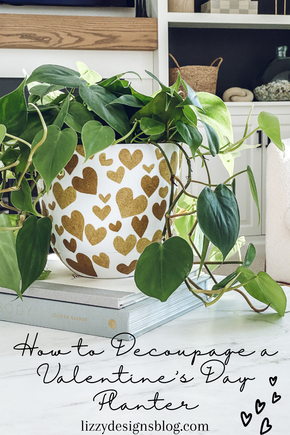 It’s hard to resist putting hearts here and there around the house in February to celebrate Valentine’s Day! I wanted to create a planter with hearts on it to celebrate and also because I love plants 🙂 This DIY Valentine’s Day Planter is easy and inexpensive, but it doesn’t look that way! Follow along as I show you how to decoupage with napkins to make this cute DIY Valentine’s Day planter.