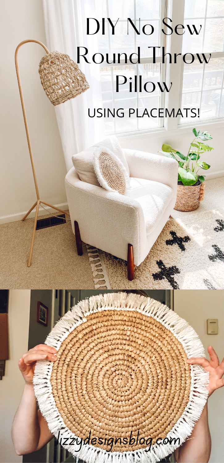 This DIY no sew round throw pillow reminds me of the pillow you can make with a dish towel! You can read all about it here. The point is to keep an open mind when you are shopping around for home decor. If you find a dishtowel or placemat that you like, you may be able to turn it into a pillow! 😉
