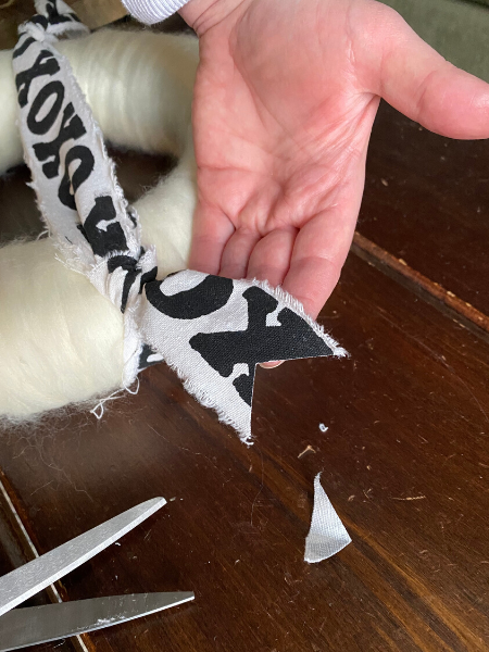 You need to place the ribbon over the top of the wreath with enough on both sides left to knot, and try to pick the perfect placement for the “xoxo” to look right in the middle. Then you just tie knots, carefully covering the floral pin area.