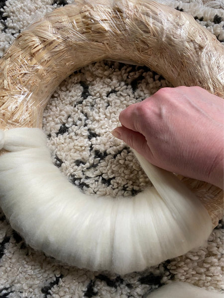With any yarn wreath you start the same, by tying a knot. Sometimes you may find it easier to take the skein of yarn and ball it up first so that it is easier to maneuver around the wreath form, but this one was fine as is.