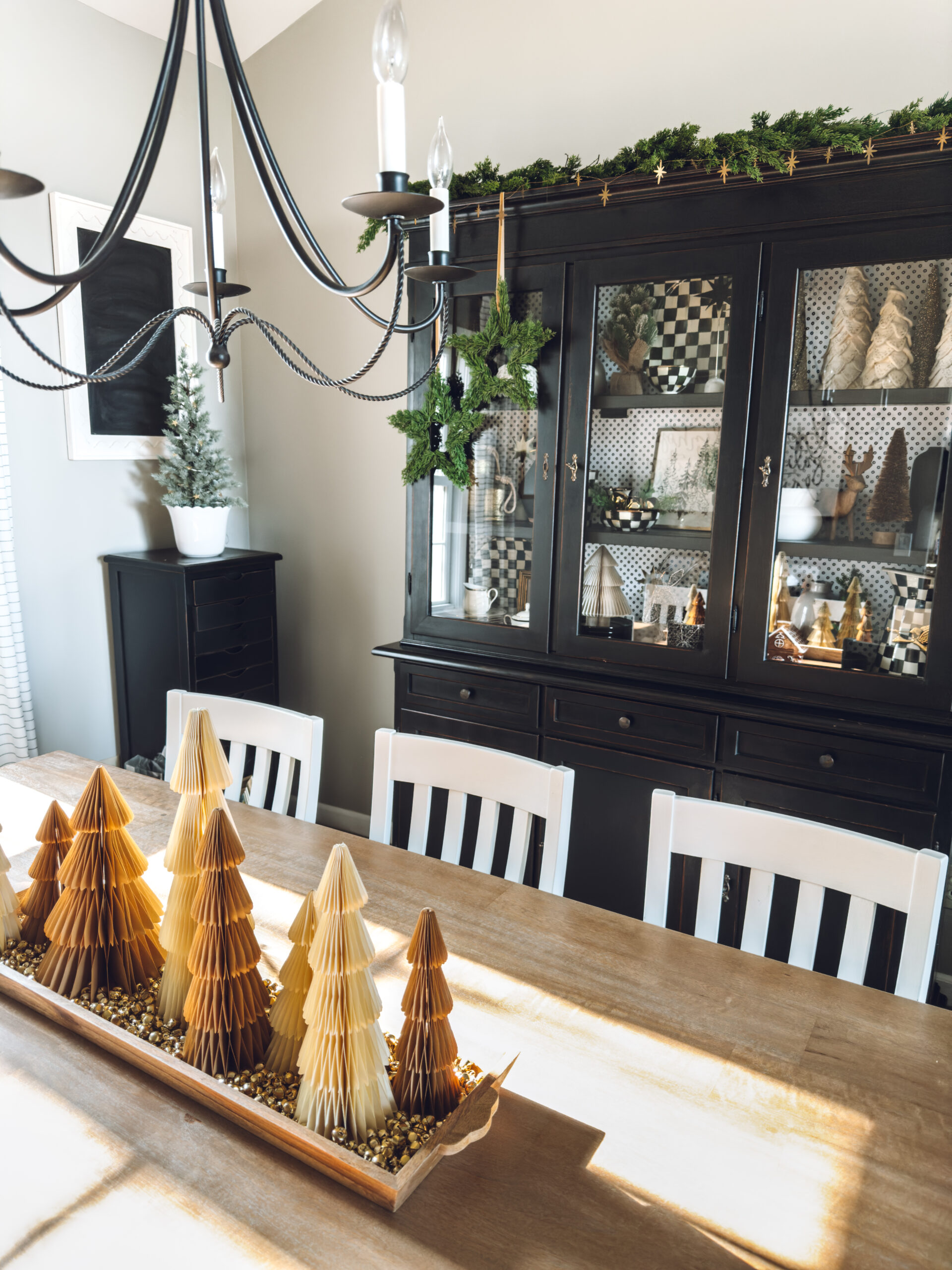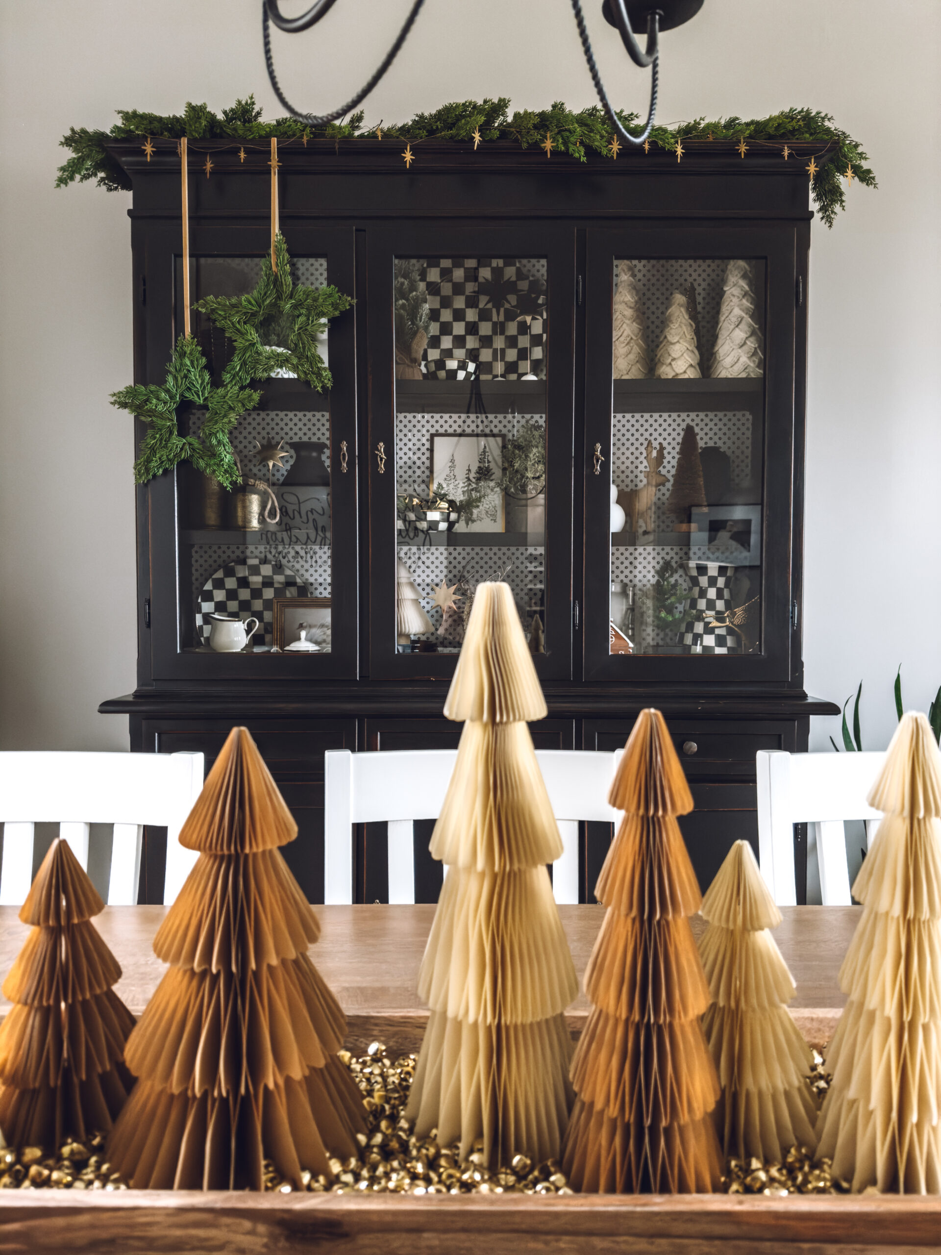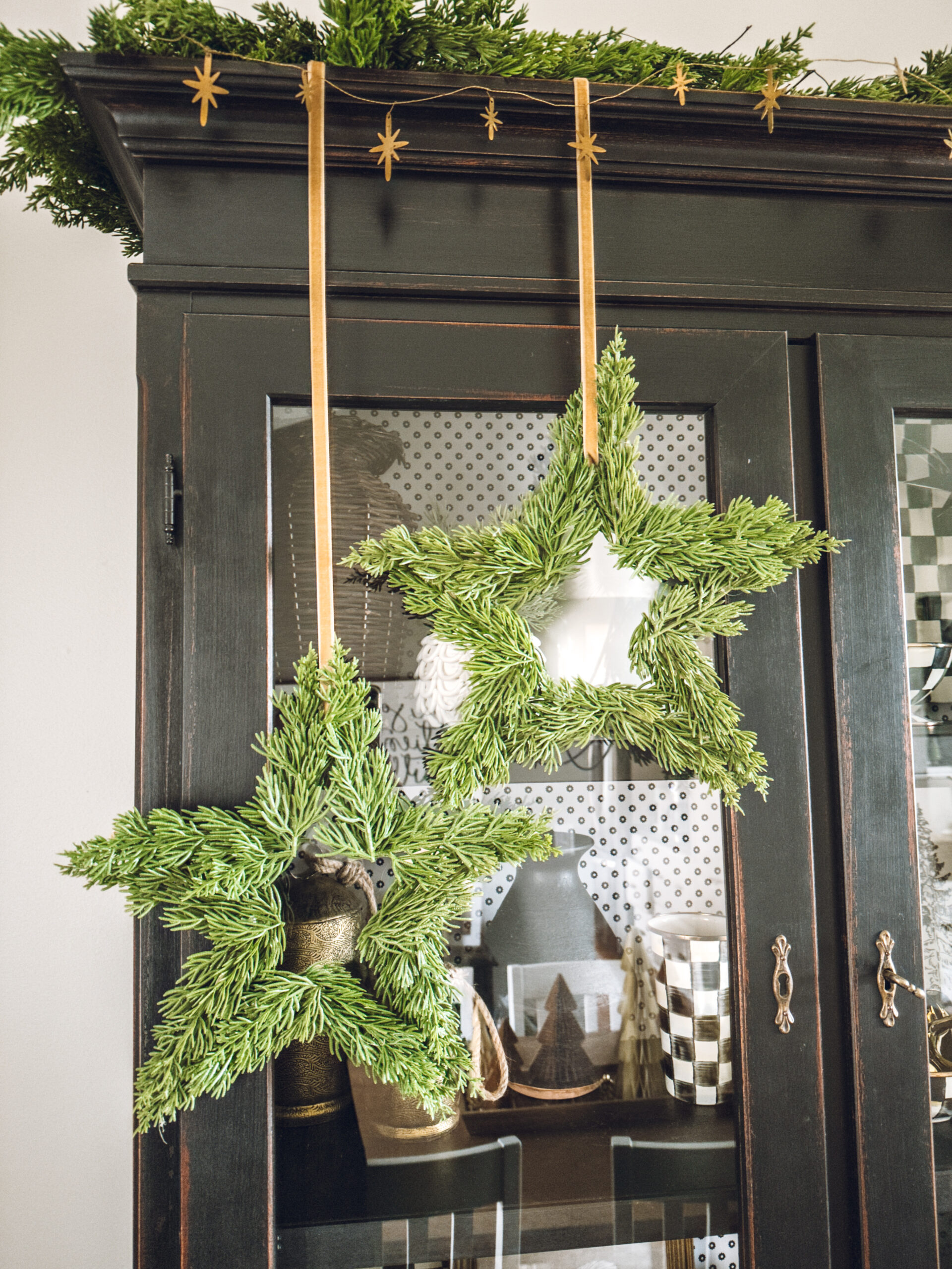 Christmas star wreaths hanging from ribbon on the cabinet